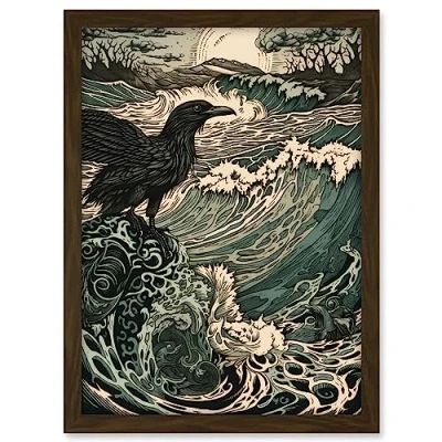 Artery8 Raven and Crashing Waves Coastal Sunrise Landscape Artwork Framed A3 Wall Art Print