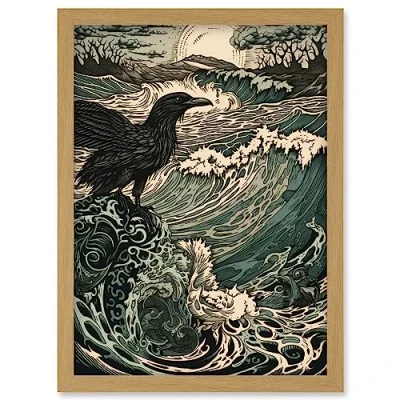 Artery8 Raven and Crashing Waves Coastal Sunrise Landscape Artwork Framed Wall Art Print A4