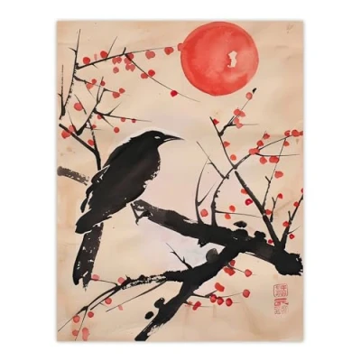 Artery8 Raven on Berry Tree Winter Sun Japanese Painting Living Room Large Wall Art Poster Print Thick Paper 18X24 Inch