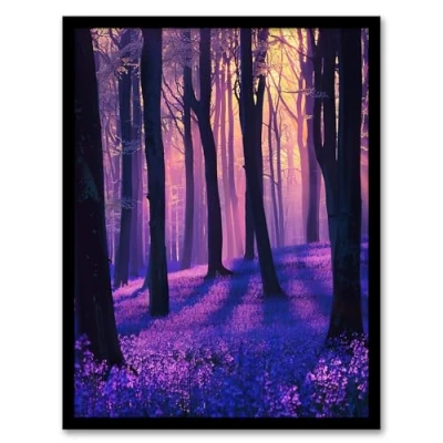 Artery8 Realistic Purple Bluebell Forest Artwork Dawn Sun Living Room Framed Wall Art Print A4