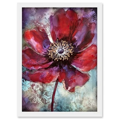 Artery8 Red Anemone Flower Bloom Watercolour Illustration Artwork Framed Wall Art Print A4