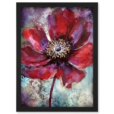 Artery8 Red Anemone Flower Bloom Watercolour Illustration Artwork Framed Wall Art Print A4