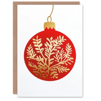 Artery8 Red Bauble Gold Botanical Decoration Ornament Blank For Him Or Her Art Christmas Card