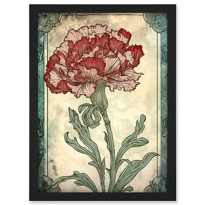 Artery8 Red Carnation Flower Bloom Watercolour Art Nouveau Artwork Framed A3 Wall Print