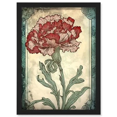 Artery8 Red Carnation Flower Bloom Watercolour Art Nouveau Artwork Framed Wall Print A4