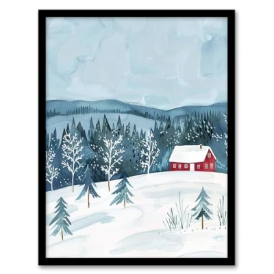 Artery8 Red Cottage in Winter Forest Landscape Folk Art Living Room Artwork Framed Wall Print A4