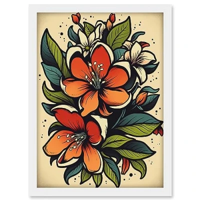 Artery8 Red Jasmine Flower Old School USA Tattoo Ink Body Rockabilly Americana 50s Artwork Framed A3 Wall Art Print