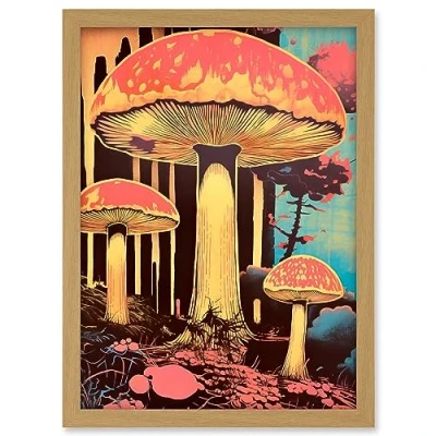 Artery8 Red Mushroom Fungi Pink Blue Bright Psychedelic Nature Kitchen Artwork Framed A3 Wall Art Print