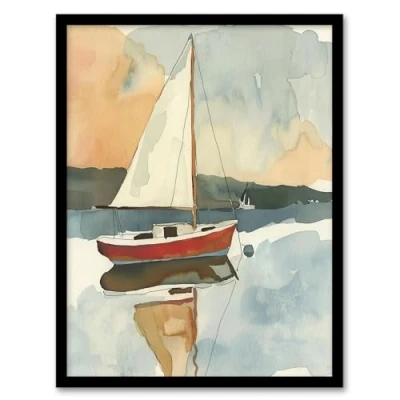 Artery8 Red Sailboat in Tranquil Sea Harbour Watercolour Bathroom Toilet Artwork Framed Wall Art Print A4