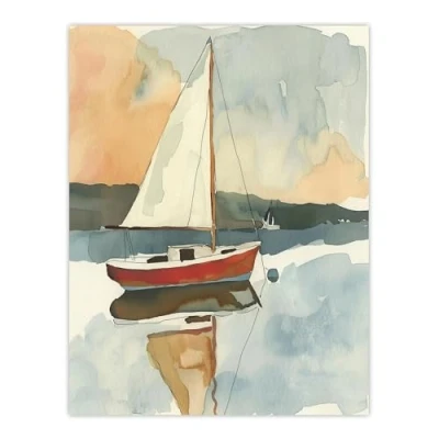 Artery8 Red Sailboat in Tranquil Sea Harbour Watercolour Bathroom Toilet Large Wall Art Poster Print Thick Paper 18X24 Inch