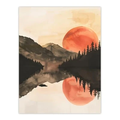 Artery8 Red Sun Setting Behind Lakeside Forest Mountains Living Room Large Wall Art Poster Print Thick Paper 18X24 Inch