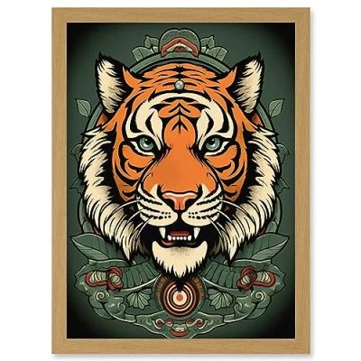 Artery8 Regal Tiger Head Old School USA Tattoo Ink Body Rockabilly Americana 50s Artwork Framed Wall Art Print A4