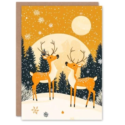 Artery8 Reindeer Forest Winter Full Moon Sun Blank For Him Or Her Art Xmas Festive Christmas Card