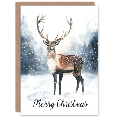 Artery8 Reindeer Misty Winter Snow Landscape Watercolour Blank For Him Or Her Art Christmas Card