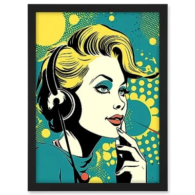 Artery8 Retro 1950's Woman Telephone Headset Comic Book Style Blue Yellow Hello Girl Portrait Artwork Framed A3 Wall Art Print