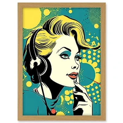 Artery8 Retro 1950's Woman Telephone Headset Comic Book Style Blue Yellow Hello Girl Portrait Artwork Framed A3 Wall Art Print