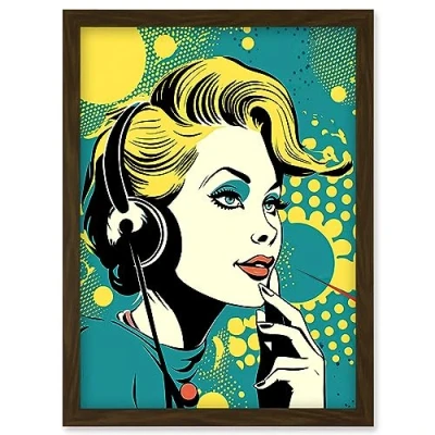 Artery8 Retro 1950's Woman Telephone Headset Comic Book Style Blue Yellow Hello Girl Portrait Artwork Framed Wall Art Print A4