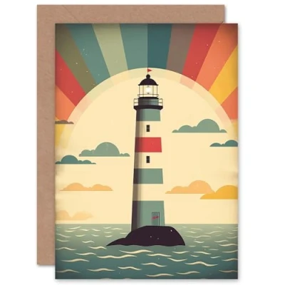 Artery8 Retro Lighthouse Sunrise for Him or Her Man Woman Birthday Thank You Congratulations Blank Art Greeting Card