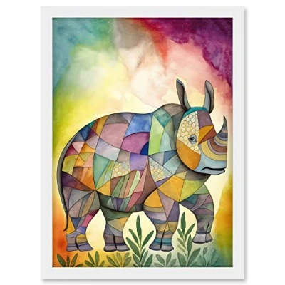 Artery8 Rhinoceros Pastel Colour Portrait Folk Art Artwork Framed A3 Wall Print