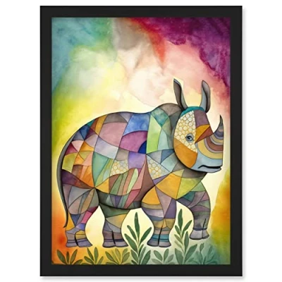 Artery8 Rhinoceros Pastel Colour Portrait Folk Art Artwork Framed Wall Print A4