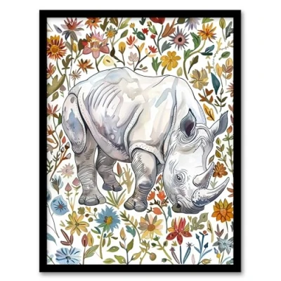 Artery8 Rhinoceros Rhino in Wildflower Meadow Watercolour Living Room Artwork Framed Wall Art Print A4