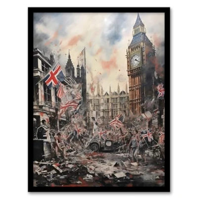 Artery8 Riot At Westminster Anarchy In The UK Big Ben Chaos Dystopian Artwork Framed Wall Art Print A4