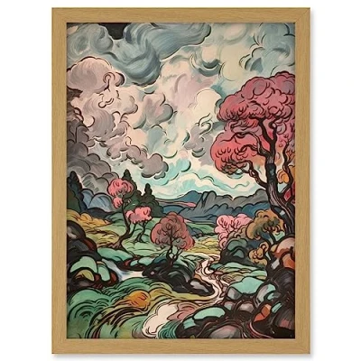 Artery8 River Landscape with Pink Trees and Storm Clouds Artwork Framed A3 Wall Art Print