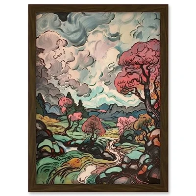 Artery8 River Landscape with Pink Trees and Storm Clouds Artwork Framed A3 Wall Art Print