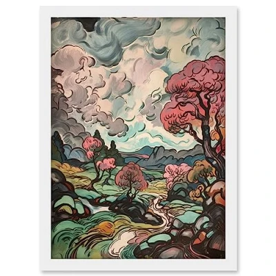 Artery8 River Landscape with Pink Trees and Storm Clouds Artwork Framed Wall Art Print A4