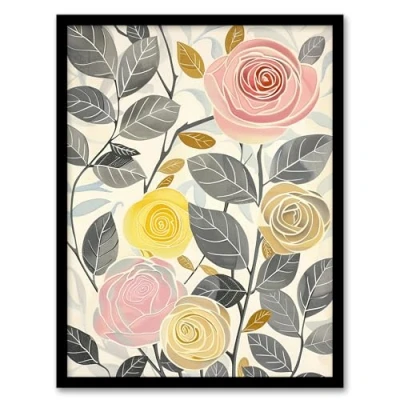 Artery8 Rose Flowers Pink Yellow Grey Bright Design Bedroom Artwork Framed Wall Art Print A4