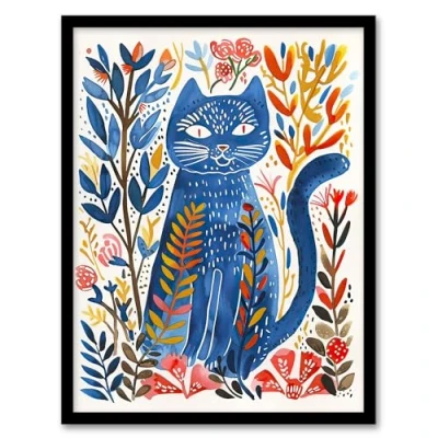 Artery8 Russian Blue Cat Lover Fun Botanical Folk Art Living Room Artwork Framed Wall Print A4