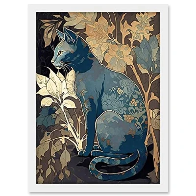 Artery8 Russian Blue Cat with Autumn Plants and Floral Pattern Fur Coat Modern Silkscreen Illustration Artwork Framed A3 Wall Art Print