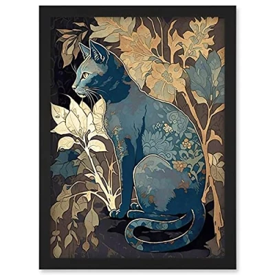 Artery8 Russian Blue Cat with Autumn Plants and Floral Pattern Fur Coat Modern Silkscreen Illustration Artwork Framed Wall Art Print A4