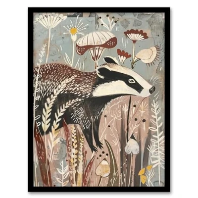 Artery8 Rustic Woodland Badger Artwork Forest Wildflowers Living Room Framed Wall Art Print A4