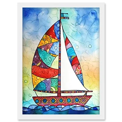 Artery8 Sailboat With Flower Pattern Folk Art Artwork Framed Wall Print A4