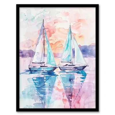 Artery8 Sailboats at Sunset Seascape Watercolour Painting Bathroom Toilet Artwork Framed Wall Art Print A4