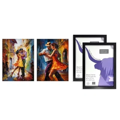 Artery8 Salsa Couple Wall Art Set of 2 A4 Sized with Black Frames Street Dance Latina Vibrant Oil Paint Décor