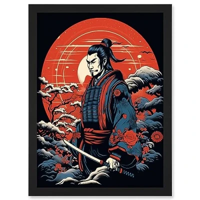 Artery8 Samurai Master in Winter Sunset Landscape Rockabilly Americana 50s Artwork Framed Wall Art Print A4