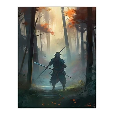 Artery8 Samurai Master Practicing Martial Arts Concept Painting Orange Green Teal Blue Warrior in Foggy Autumn Bamboo Forest Landscape Large Wall Art Poster Print Thick Paper 18X24 Inch