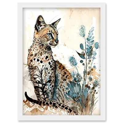 Artery8 Savannah Cat and Wildflowers Modern Watercolour Ink Illustration Artwork Framed Wall Art Print A4