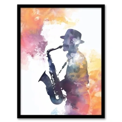 Artery8 Saxophone Jazz Musician Orange Purple Watercolour Living Room Artwork Framed Wall Art Print A4