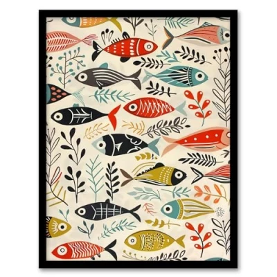 Artery8 Scandi Fish Sea Kelp Design Colourful Rustic Bathroom Toilet Artwork Framed Wall Art Print A4