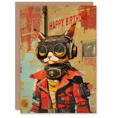 Artery8 Sci Fi Space Tabby Race Atompunk Style Cat Lover Blank For Him Or Her Art Birthday Card