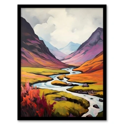 Artery8 Scotland Glencoe Valley Oil Painting Majestic Mountains And River With Heather Shrubs Artwork Framed Wall Art Print A4