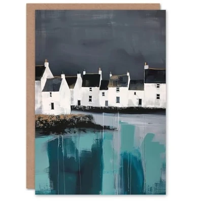 Artery8 Scottish Coastal Village Oil Painting Grey Sky Greeting Birthday Card Him Her All Blank