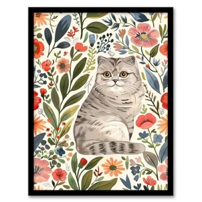 Artery8 Scottish Fold and Rustic Floral Pattern Cat Lover Living Room Artwork Framed Wall Art Print A4
