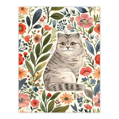 Artery8 Scottish Fold and Rustic Floral Pattern Cat Lover Living Room Extra Large XL Wall Art Poster Print