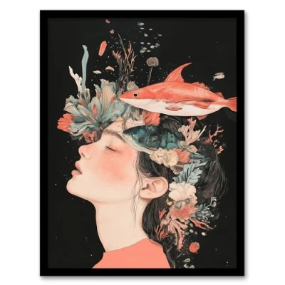 Artery8 Sea Dream Coral Reef Fish Woman Surreal Portrait Bathroom Toilet Artwork Framed Wall Art Print A4