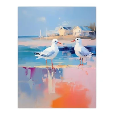 Artery8 Seagull Birds Oil Painting Pastel Colour Pink Blue Orange Coastal Landscape Bathroom Artwork Large Wall Art Poster Print Thick Paper 18X24 Inch