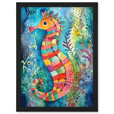 Artery8 Seahorse In Aquatic Plants Folk Art Artwork Framed A3 Wall Print